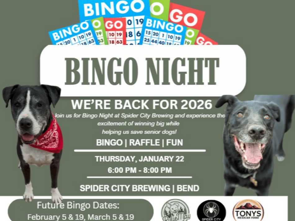 Get ready to dab your way to helping pups in need at Bingo for Senior Dogs on Thursday, Jan. 22 from 6 – 8 pm at Spider City Brewing! This playful fundraiser benefits RylieMay Rescue Ranch, a Central Oregon nonprofit dedicated to senior and disabled dogs. Bingo cards are just $1–$3, and there’ll be chances to win prizes, enjoy tasty bites from Tony’s Mexican food truck, and relax with friends while sipping drinks—Spider City Brewing will donate $1 from every beverage purchase to the cause. (visitbend.com)