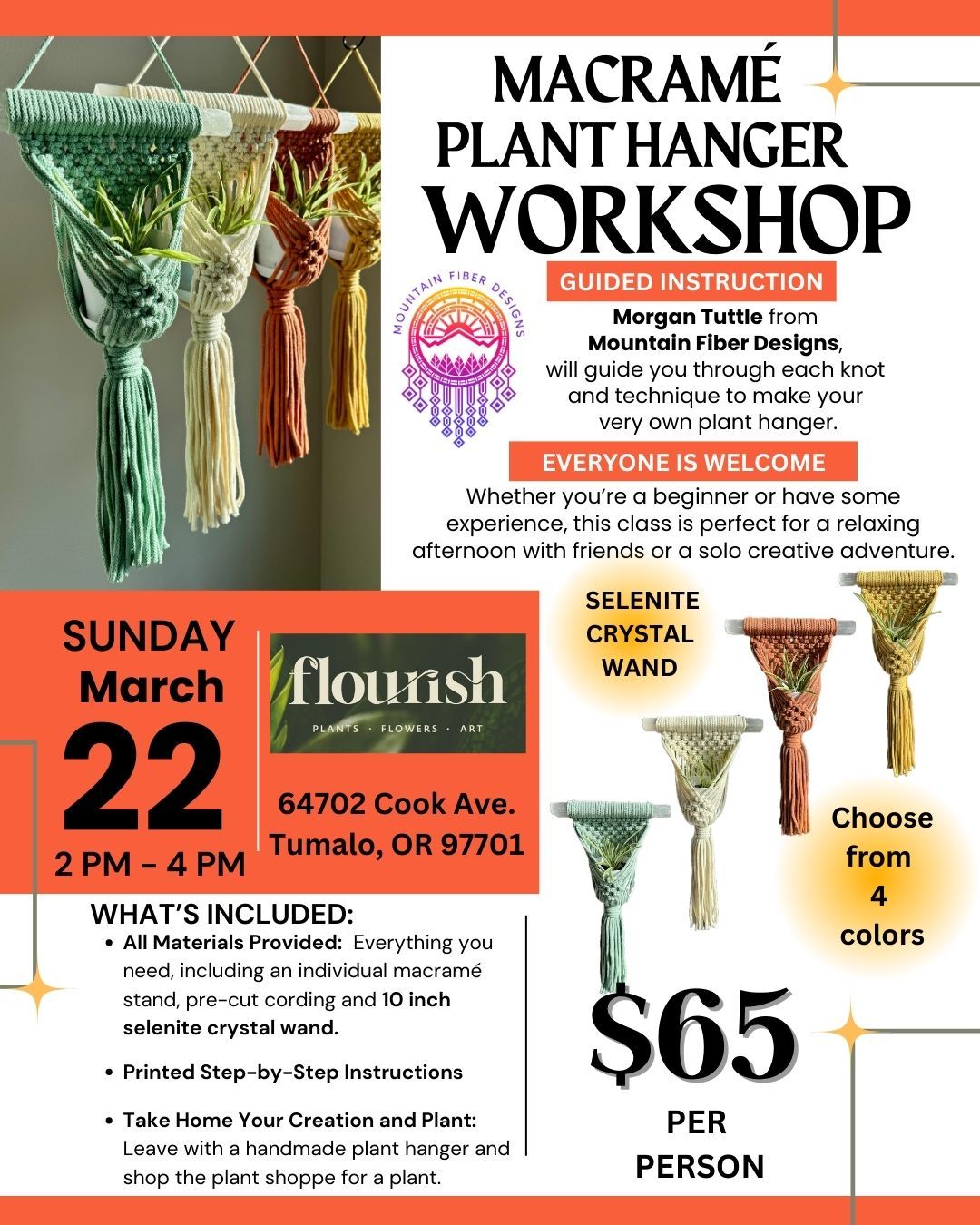 Join us for a fun and creative macrame plant hanger class where you’ll learn the art of knotting and design your very own plant hanger masterpiece. What to Expect: Guided Instruction: Morgan Tuttle from Mountain Fiber Designs, will guide you through each knot and technique to make your very own macramé plant hanger on selenite crystal wand. The class will be approximately 2 hours. All Materials Provided: We supply everything you need, including an individual macramé stand, pre-cut cording and printed instructions. Take Home Your Creation: Leave with a handmade plant hanger and purchase a plant from the plant shoppe to showcase your newfound skills. Who Can Join? Whether you’re a complete beginner or have some experience, everyone is welcome! This class is perfect for a relaxing afternoon with friends or a solo creative adventure.